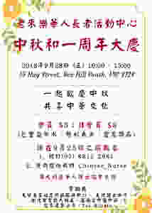 為了跟大家分享我們的喜悅,並且一起慶祝這對於華人來說至關重要的節日 – 中秋節,我們將在9月28日禮拜五舉辦中秋節暨老來樂一周年慶祝會,當天幾大墨爾本年長者協會的領頭人也將受邀出席參加我們的活動,希望藉由這樣喜慶的場合,與各位嘉賓報告我們老來樂華人長者活動中心在這一年內的成長,還有未來的發展展望;當天,澳大利亞華人護士協會也準備了一齣齣別具風采的節目、一盤盤豐盛的餐點,還有一樣樣精緻的禮品,等著您的蒞臨。